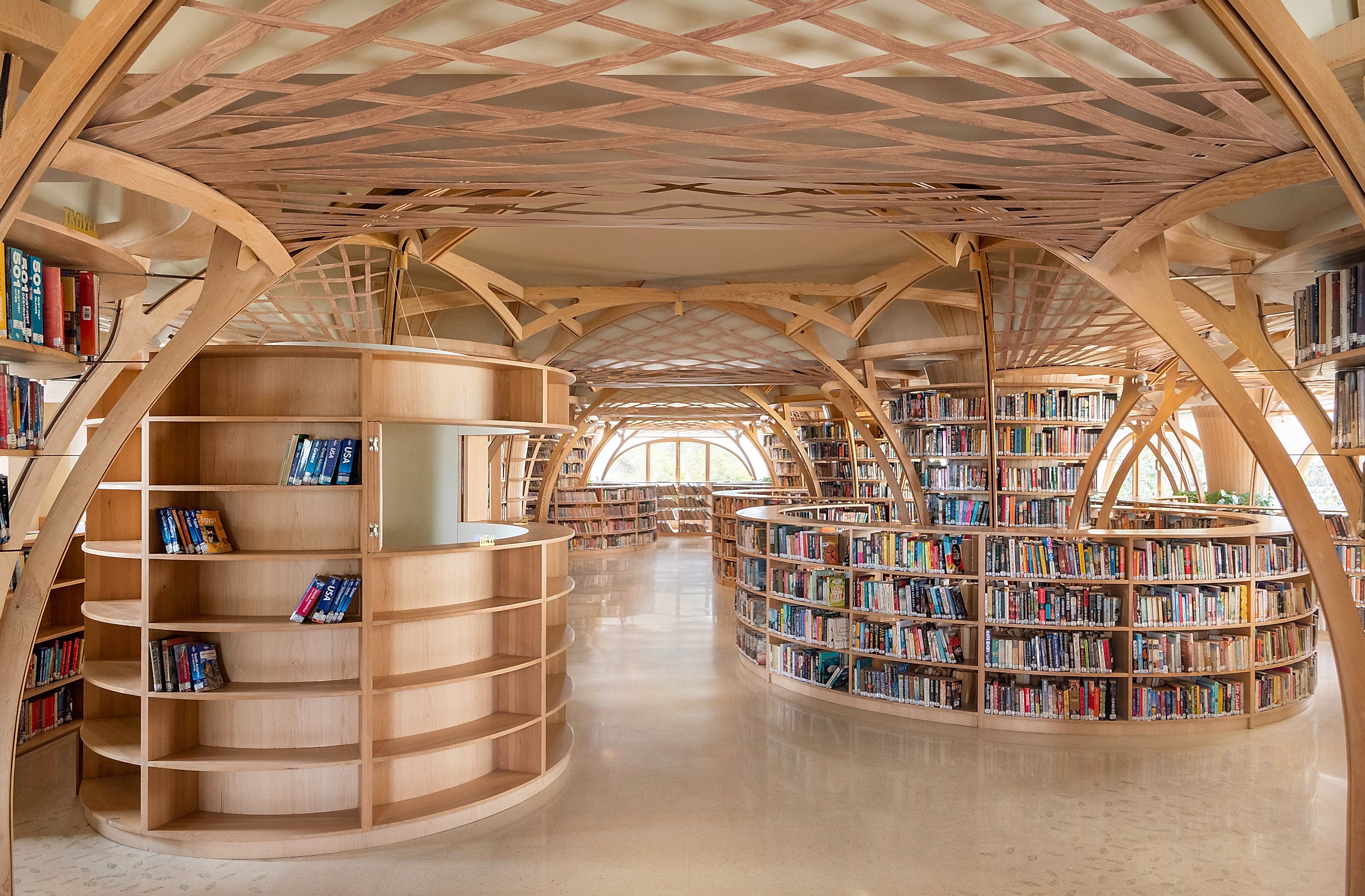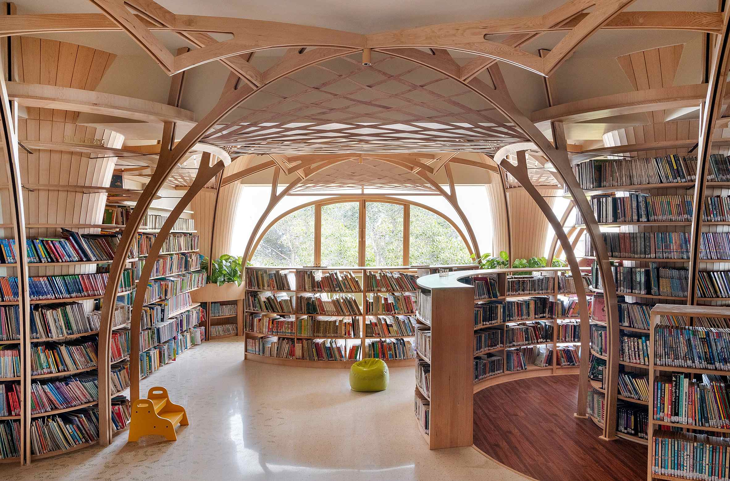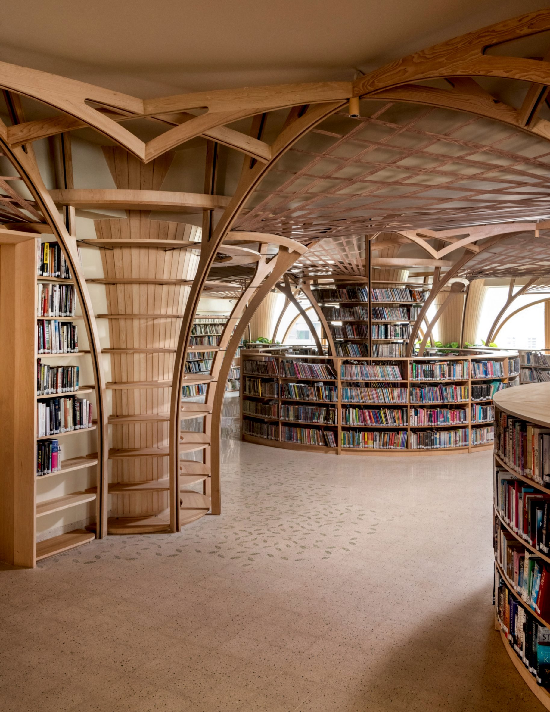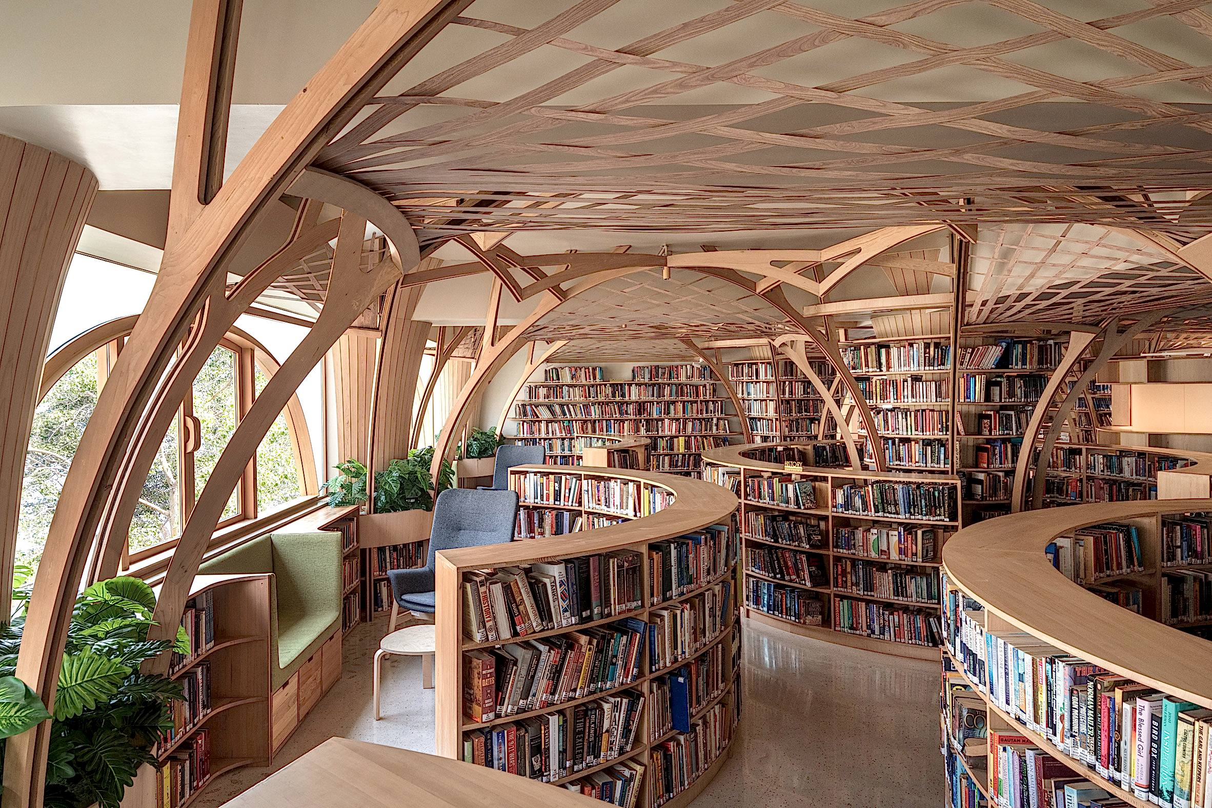 Kolonların etrafında dairesel bir şekilde düzenlenen kavisli kitap rafları, hem mekânsal bir akış sağlamış hem de ziyaretçilere yarı özel köşeler sunarak kişisel alan yaratma imkânı tanımıştır.