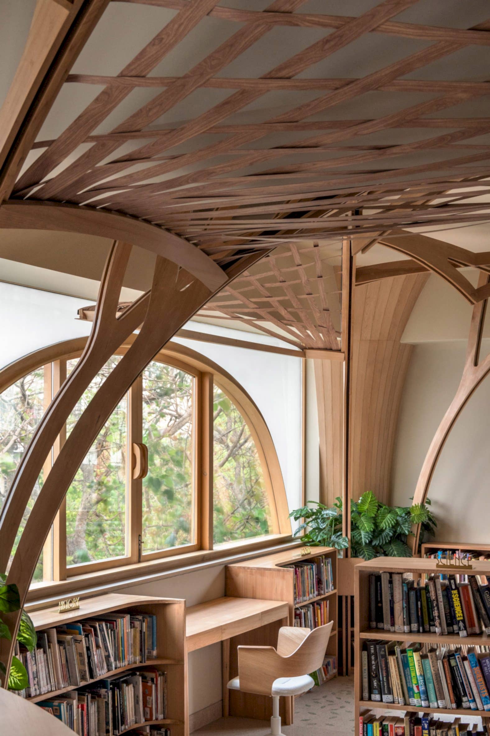 Güney Mumbai'deki ‘Cricket Club of India’ için tasarlanan bu kütüphane, 1930'lara kadar uzanan köklü geçmişiyle dikkat çekiyor. Hinge Studio tarafından hayata geçirilen bu projede, art deco stilindeki tarihi bir binanın üçüncü katı yenilenerek çağdaş ve işlevsel bir mekâna dönüştürülmüştür. Projede beton kolonlar, ziyaretçilerine adeta bir ağacın gölgesinde oturuyormuş hissi verecek şekilde özenle yeniden yorumlanmıştır.